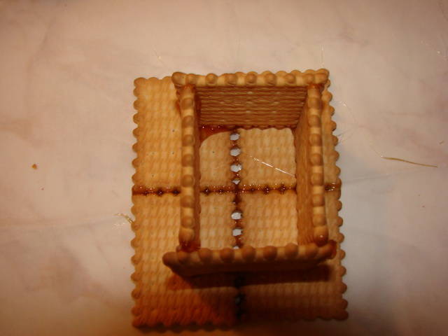 Κατόπιν σχηματίζουμε από πάνω με 4 μπισκότα ένα κουτάκι παραλληλόγραμμο δηλαδή οι δυο πλευρές είναι πιο μεγάλες (τα δύο απέναντι μπισκότα τα βάζουμε κάθετα και τα άλλα δύο απέναντι οριζόντια), το οποίο και κολλάμε στην βάση.