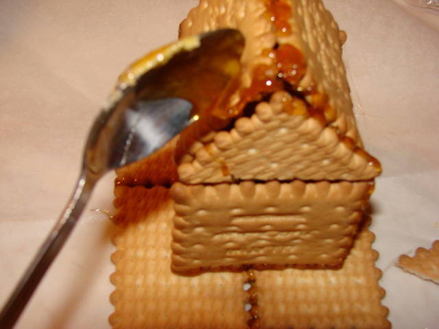 Τοποθετούμε 4 μπισκότα για την βάση σχηματίζοντας ένα τετράγωνο βουτώντας την άκρη του μπισκότου που θα είναι το σημείο ένωσης στην ζεστή καραμέλα. Σταθεροποιείται αμέσως. Κάνουμε γρήγορες αλλά προσεχτικές κινήσεις.