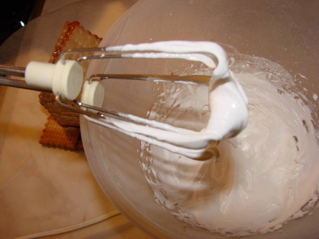 Χτυπάμε τα ασπράδια με το λεμόνι στο μίξερ. Μόλις αρχίσουν να αφρίζουν ρίχνουμε την άχνη και την βανίλια και χτυπάμε σε χαμηλή ταχύτητα να μη πεταχτεί η άχνη και μετά σε πιο δυνατή ταχύτητα μέχρι να στέκεται το μίγμα στο σύρμα του μίξερ.