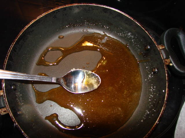 Σε ένα αντικολητικό σαγανάκι ή άλλο σκεύος (μόνο αντικολητικό) ρίχνουμε την κρυσταλλική ζάχαρη και λιώνουμε σε πολλή χαμηλή θερμοκρασία (στο νούμερο 1 ή 2 της κουζίνας) ανακατεύοντας με ένα κουτάλι. Γίνεται σαν σιρόπι αλλά προσοχή γιατί καίγεται πολύ εύκολα και προσοχή να μην καείτε. Αν κοκαλώσει το ξαναζεσταίνετε λίγο και λειώνει.