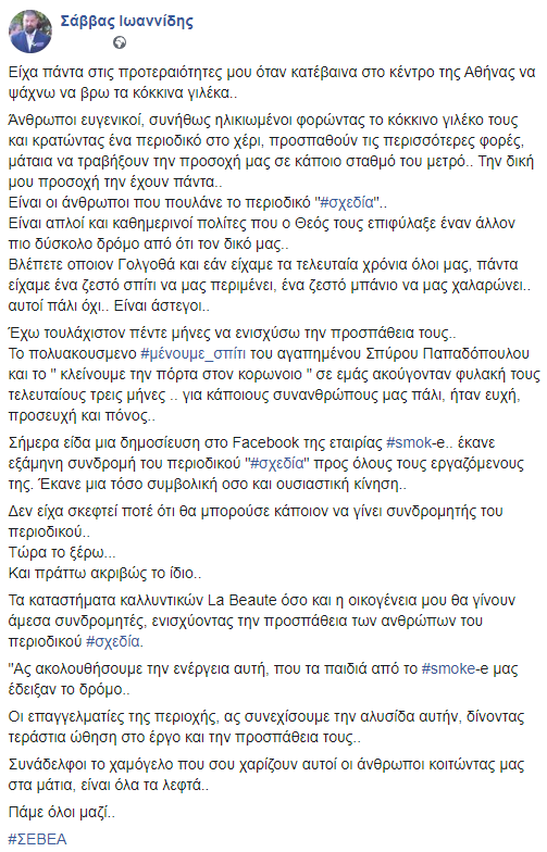 “Συνάδελφοι το χαμόγελο που σου χαρίζουν αυτοί οι άνθρωποι κοιτώντας μας στα μάτια, είναι όλα τα λεφτά…” τονίζει σε ανάρτησή του ο ιδιοκτήτης των καταστημάτων La Beaute, ο οποίος όπως αποκάλυψε, εμπνεύστηκε από την εταιρία smok-e, η οποία έκανε εξάμηνη συνδρομή του περιοδικού Σχεδία προς όλους τους εργαζόμενούς της.