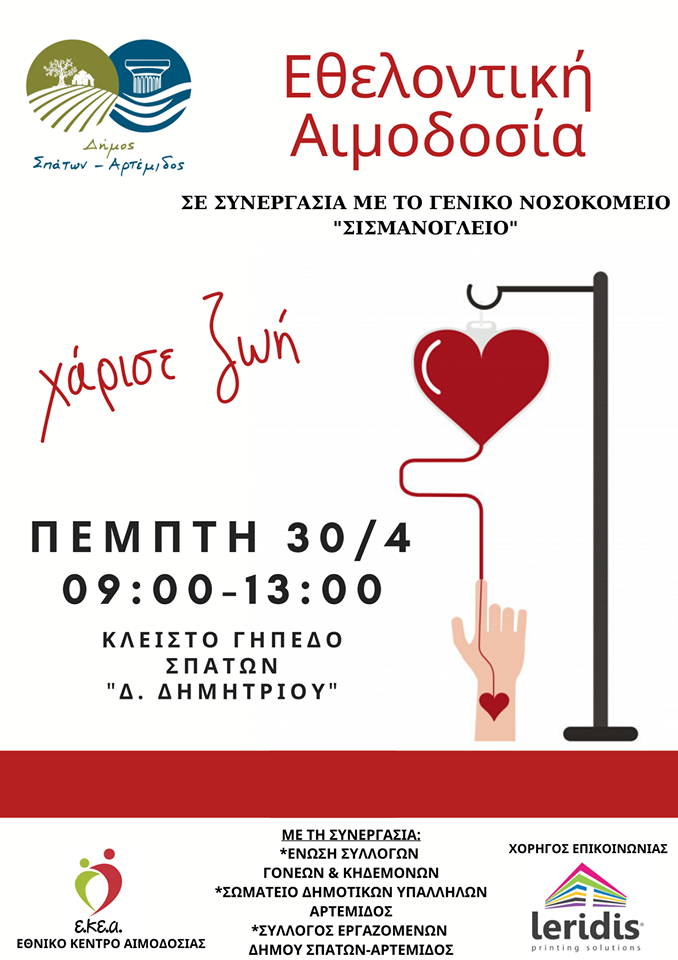 Με στόχο να εξασφαλιστεί η επάρκεια αίματος για τους συνανθρώπους μας που το έχουν ανάγκη, ο Δήμος Σπάτων – Αρτέμιδας καλεί τακτικούς και νέους αιμοδότες, που δεν αντιμετωπίζουν κάποιο πρόβλημα υγείας, για αιμοδοσία, προκειμένου να καλυφθούν οι μεγάλες ανάγκες σε αίμα που έχουν προκύψει το τελευταίο διάστημα.