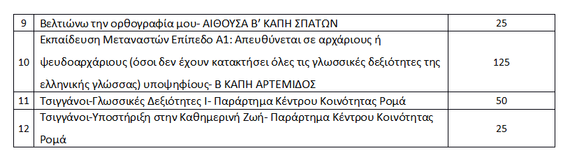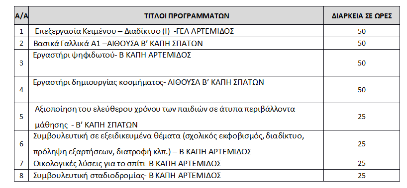 Στο Κ.Δ.Β.Μ. του Δήμου Σπάτων-Αρτέμιδος μπορούν να δημιουργηθούν τμήματα για τα ακόλουθα προγράμματα: