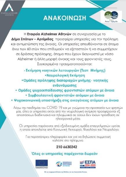 Η Εταιρεία Alzheimer Αθηνών, σε συνεργασία με τον Δήμο Σπάτων – Αρτέμιδας, προσφέρει υπηρεσίες για την πρόληψη και αντιμετώπιση της άνοιας.